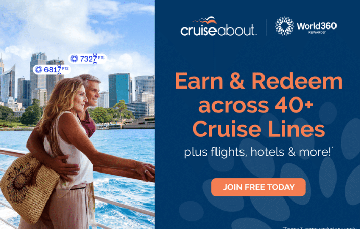 Set sail with our loyalty program World360 Rewards.  Earn and redeem points across 40+ cruise lines, plus flights, hotels and more* every time you book with Cruiseabout.
