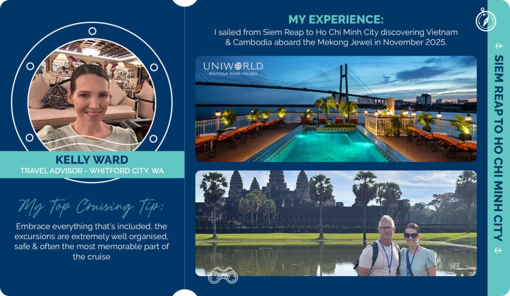 Cruiseabout Whitford City Travel Advisor, Kelly Ward, recently travelled from Siem Reap to Ho Chi Minh City on a seven-day Uniworld itinerary designed to reveal the Mekong in depth. From ancient temples to vibrant urban life, the journey reflected Uniworld’s signature approach, immersive destinations paired with an onboard experience that feels indulgent, expressive and unmistakably its own.