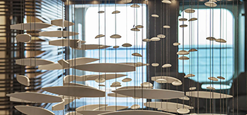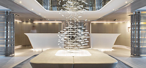 A sleek silhouette, a welcoming intimate atmosphere, discover aboard this new ship the philosophy that has made our sisterships such a success: the spirit of Yacht Cruises. Sailing under the French flag, this magnificent yacht of only 122 staterooms and Suites, with balconies, has joined our fleet in April 2015. You will be enchanted by the contemporary decor inspired by the our destinations and the blue light of the Vega star in the Lyra constellation. The result is a subtle variation around a palette of blues, ranging from the luminous delicate grey-blue of the Polar ice to splashes of the vivid turquoise blue found in Mediterranean coves A refined ambiance is enhanced by the quality of the workmanship and materials: white Corian counters in the lobby contrast with the warmth of leather to recall a boat’s hull, while the central sculpture of enamelled pieces takes its inspiration from the sea. In the loungebar, the carpet picks up a tennis stripe theme symbolising a certain idea of cruising, one synonymous with French elegance and a chic seaside spirit.