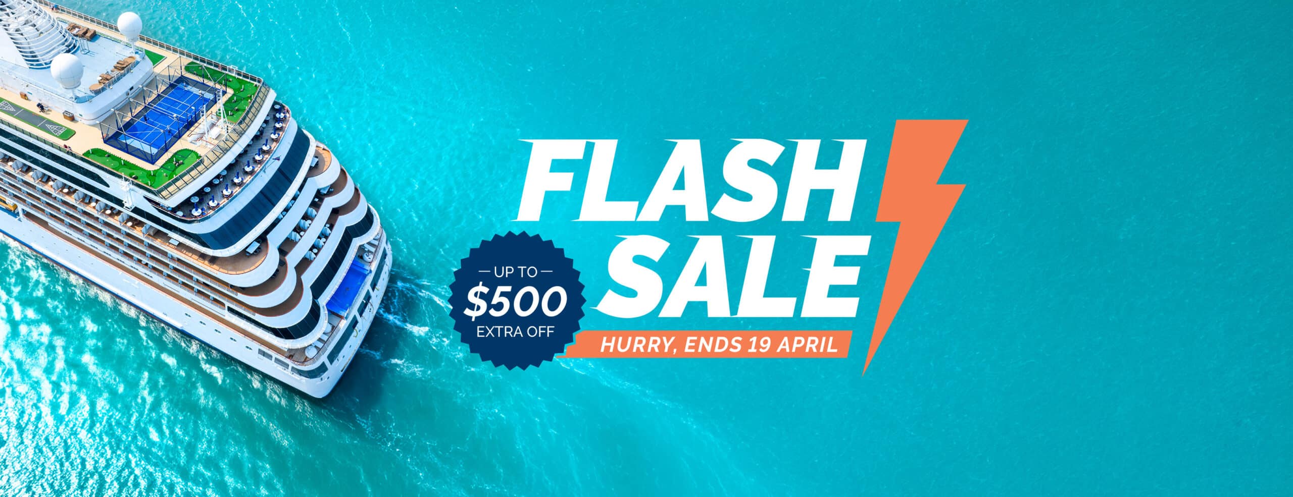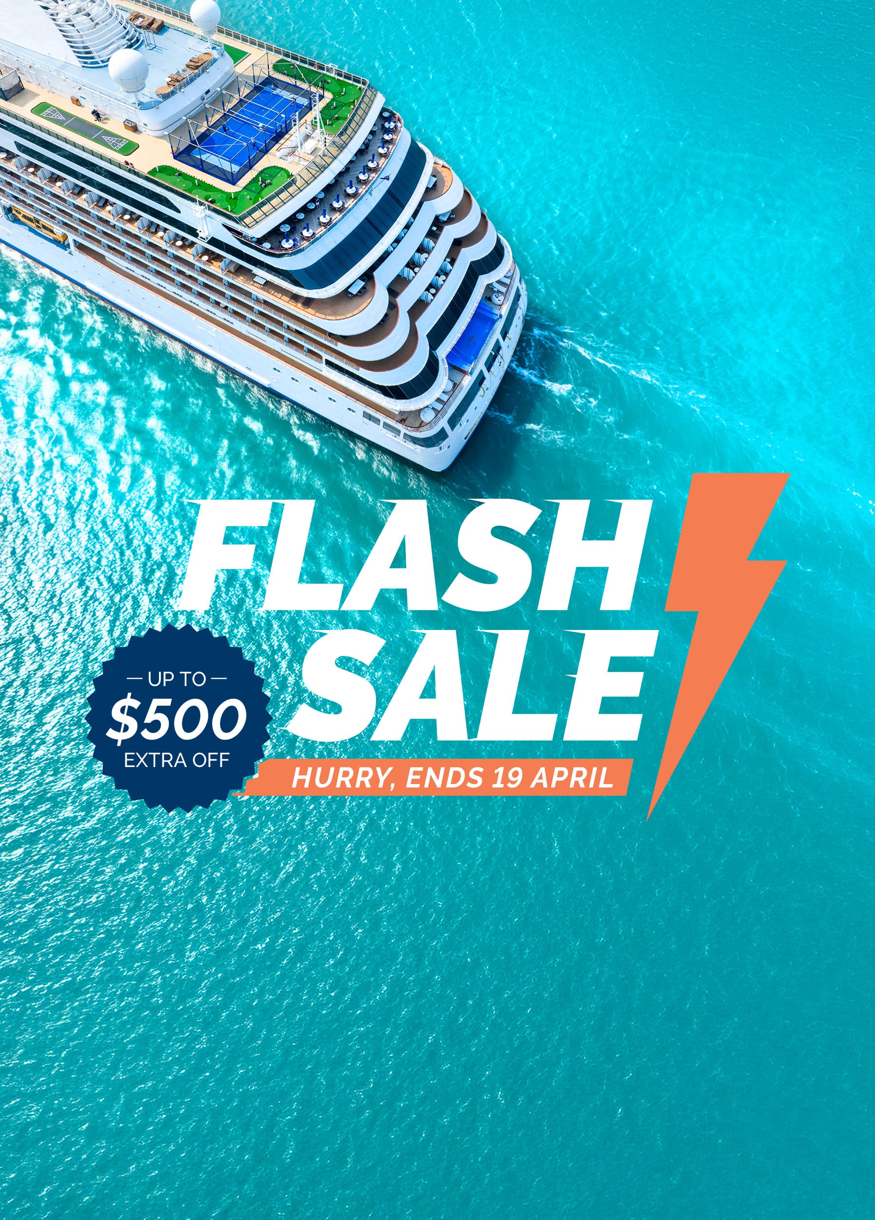 $250 per booking savings applies to new bookings of $5,000 or more per booking. $500 per booking savings applies to new bookings of $10,000 or more per booking. Offer valid for bookings made between Thursday 16 April and Sunday 19 April 2026 4PM AEST only. Offer is valid for new bookings only. Bookings must include a cruise component to be eligible. The voucher cannot be used towards deposits and is not combinable with any other voucher. The discount will be applied to the final booking price. Only one voucher is permitted per booking. Offer is not valid for employees of Flight Centre Travel Group or their families.