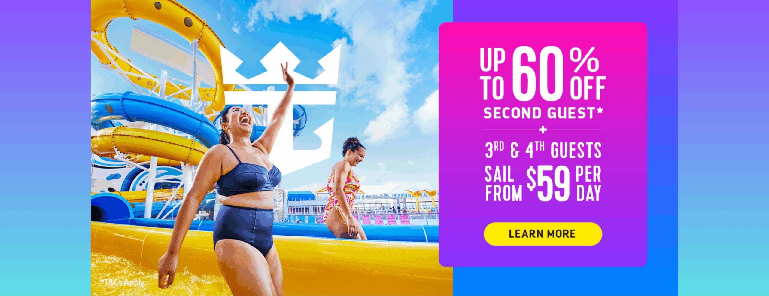 Ready to take your holiday next level? For a limited time, enjoy up to 60% off your second guest PLUS your 3rd & 4th sail from only $59 per day!