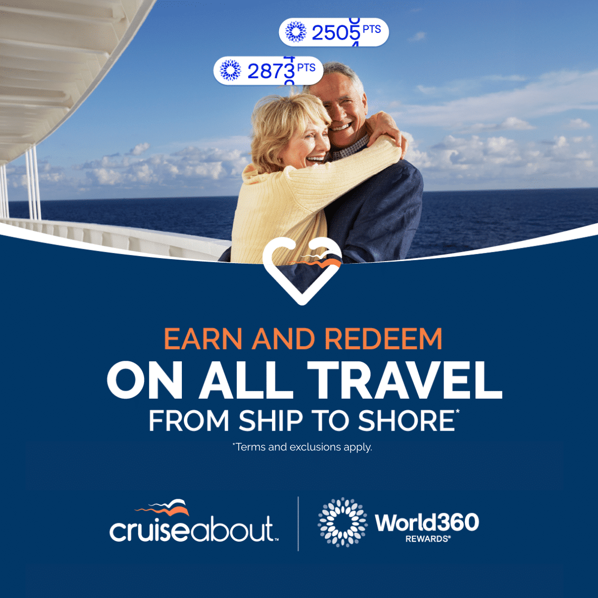 World360 Rewards is Cruiseabout’s loyalty program, giving members the ability to earn and redeem points on cruises, flights, hotels, tours and more.