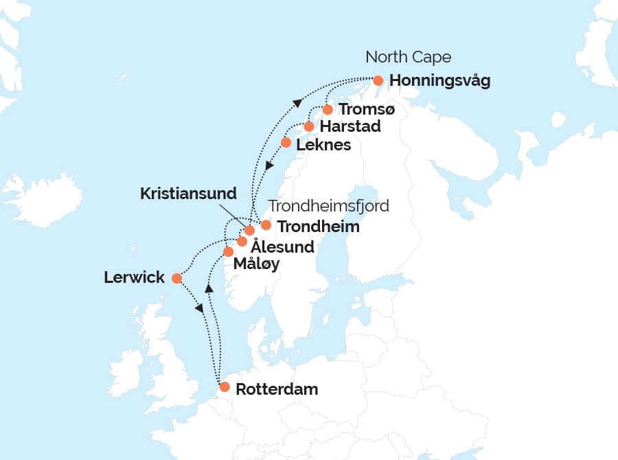 Embark on an unforgettable Arctic adventure as you sail round‑trip from Rotterdam on this immersive 15‑day cruise and stay journey through Norway’s dramatic fjords and beyond the Arctic Circle. From charming coastal towns and storied Viking ports to the raw beauty of the North Cape, this itinerary blends breathtaking scenery with rich Nordic culture and history. Enjoy scenic cruising, captivating destinations in Norway and Scotland, and the refined comfort of Holland America Line’s Rotterdam—all culminating in a truly extraordinary voyage to the top of Europe.