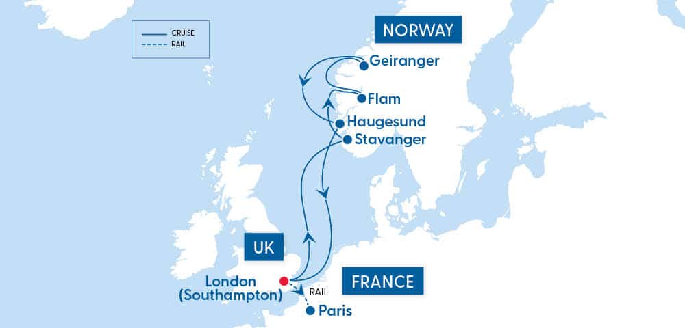 Explore the vibrant capital of the UK before setting sail for the breathtaking beauty of the Norwegian Fjords. After returning to London, journey by rail to Paris and spend your final nights in the city of light and the global centre of art, fashion, gastronomy, and culture.