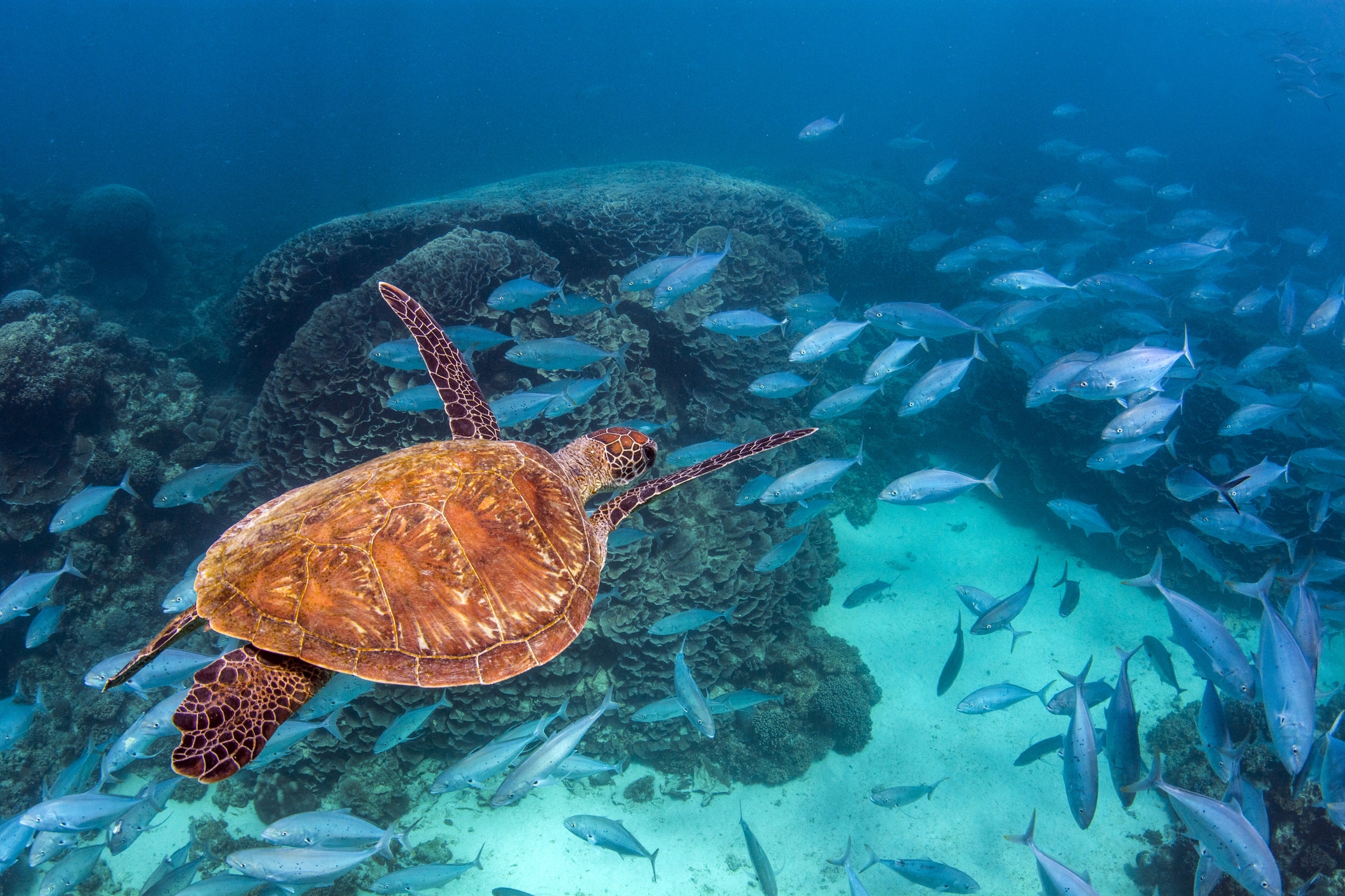 ...Lost in the immensity of the Indian Ocean and situated 630 km off Broome, Ashmore Reef Marine Park is an Australian External Territory that covers 583 square km. With its diverse shades of blue, its underwater wonders, and feathery friends, this protected area is one of Australia’s most beautiful natural treasures. The three tiny islands and their surrounding waters are home to an oasis of flourishing wildlife. Ashmore Reef is known to be the favorite place of more than 40 bird species. 100,000 seabirds breed there every year, including crested terns, white-tailed tropicbirds, and greater frigatebirds. The islands are also a haven for thousands of migratory shorebirds like curlew sandpipers, bar-tailed godwits, and great knots – some of them coming from very far places like Siberia! On the ocean side, the colorful reef is home to around 500 species of fish but also marine turtles, dugongs, and many playful dolphins. Given the rich and fragile environment, Ashmore Reef has been declared a Sanctuary zone, providing the highest level of protection for the wildlife and minimizing disturbance from human activities. Only scientific research is permitted but the visitors can access the Recreational Use Zone, which includes a small area of the West Island, and thus discover this unique place.