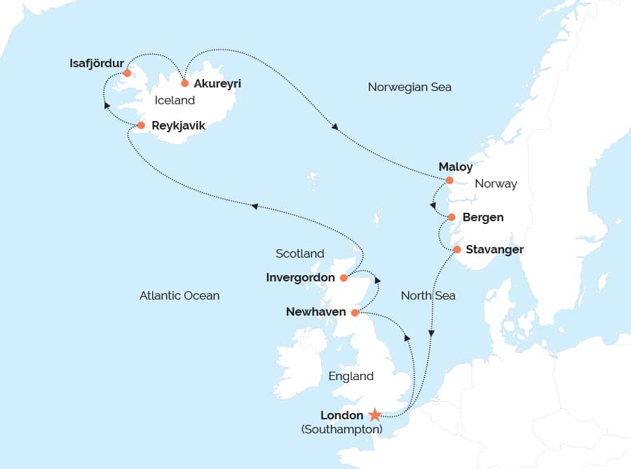 ...Your cruise holiday concludes today in London. Reflect on the awe-inspiring landscapes of Iceland as you say goodbye to new friends and cherish the memories of your journey.