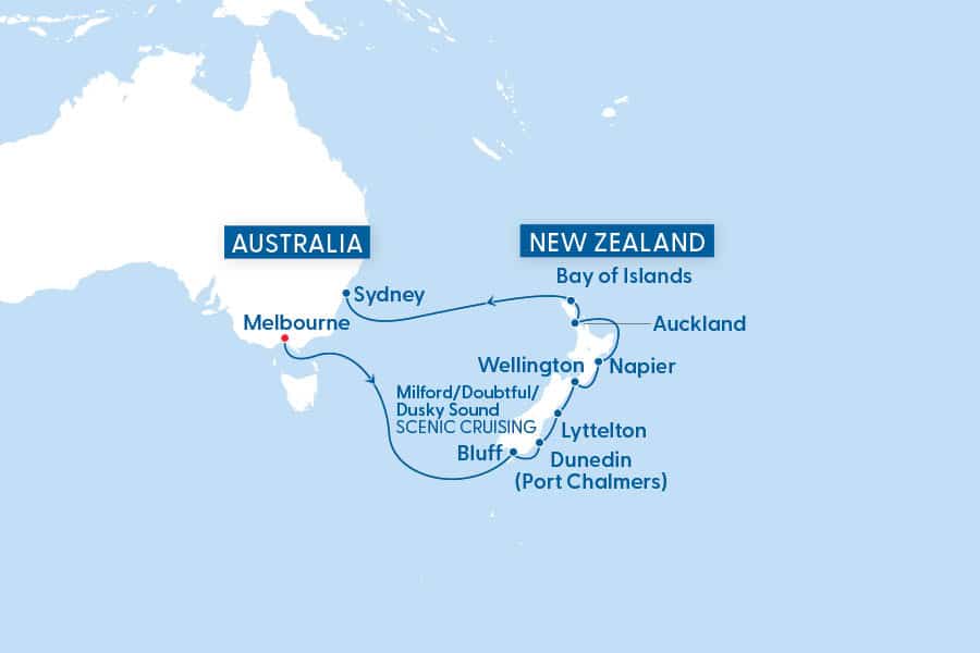 Cross the ditch to New Zealand, where you’ll uncover the misty fjords of Milford Sound and subtropical shores of the Bay of Islands, before sailing back to Australia, arriving in the iconic Sydney Harbour.