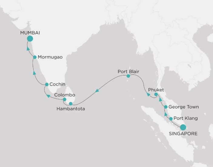 After leaving Singapore, this richly varied voyage arrives at Port Klang, the cultural gateway to Kuala Lumpur, closely followed by Georgetown on Penang, a colorful city that blends Malay and Chinese cultures. The blissful beaches in Phuket, Thailand, are next, before Port Blair, a remote island in the Andaman Sea that is well off the tourist trail. After two days at sea, our next stop is Hambantota, with its botanical gardens, then we sail to Colombo, Sri Lanka’s bustling capital. We set a leisurely pace spending a day sailing to Cochin, then another day sailing to Goa’s serene shores at Mormugao. We conclude our journey with an overnight stay in Mumbai, and ample opportunity to soak up the city’s effervescent energy.