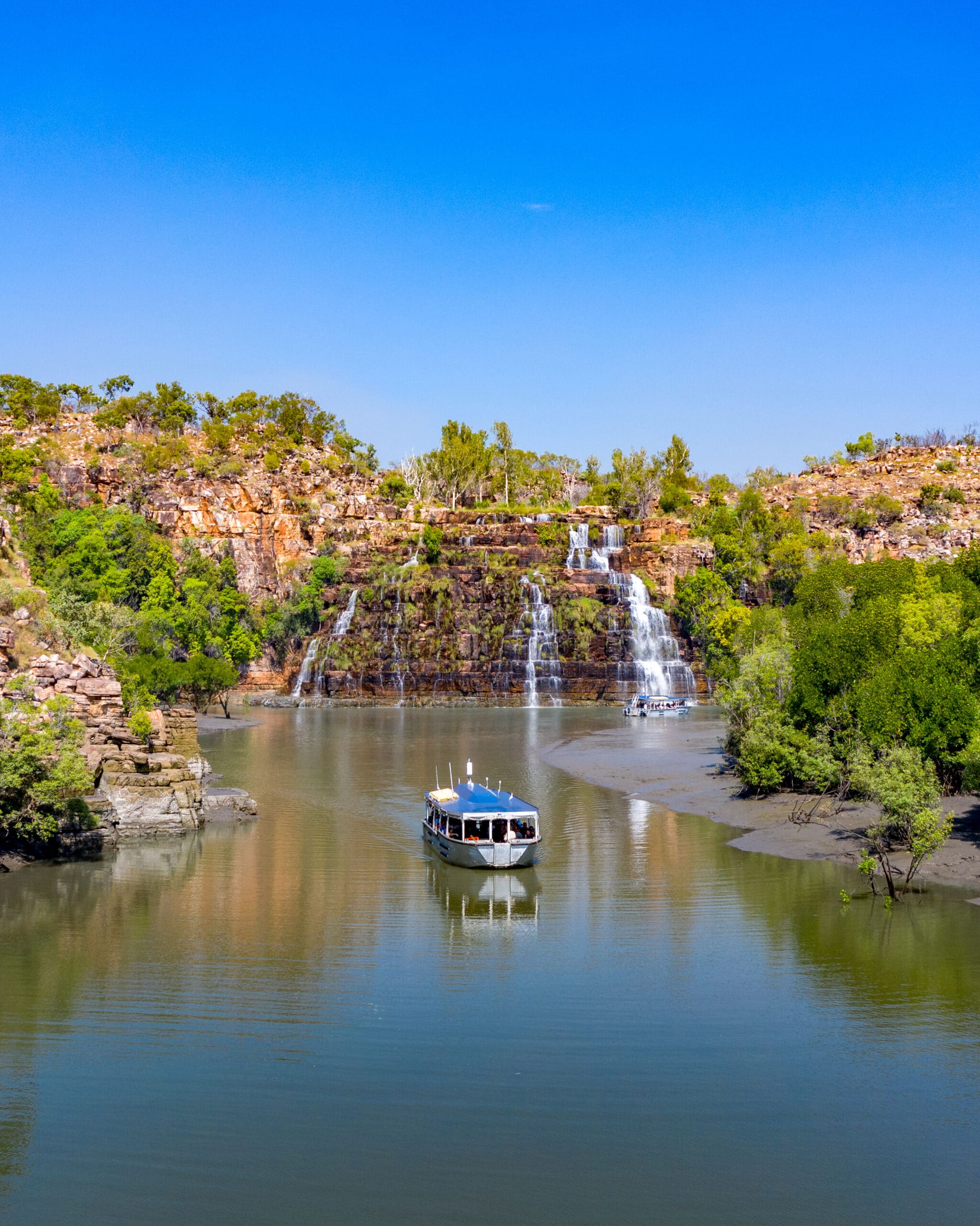 ...Traverse down the straight fault-line of the Prince Regent River by tender to reach King Cascade. From Xplorers’ view, cascading layered falls and lush vegetation, framed by dramatic sandstone walls, rush into the river below.